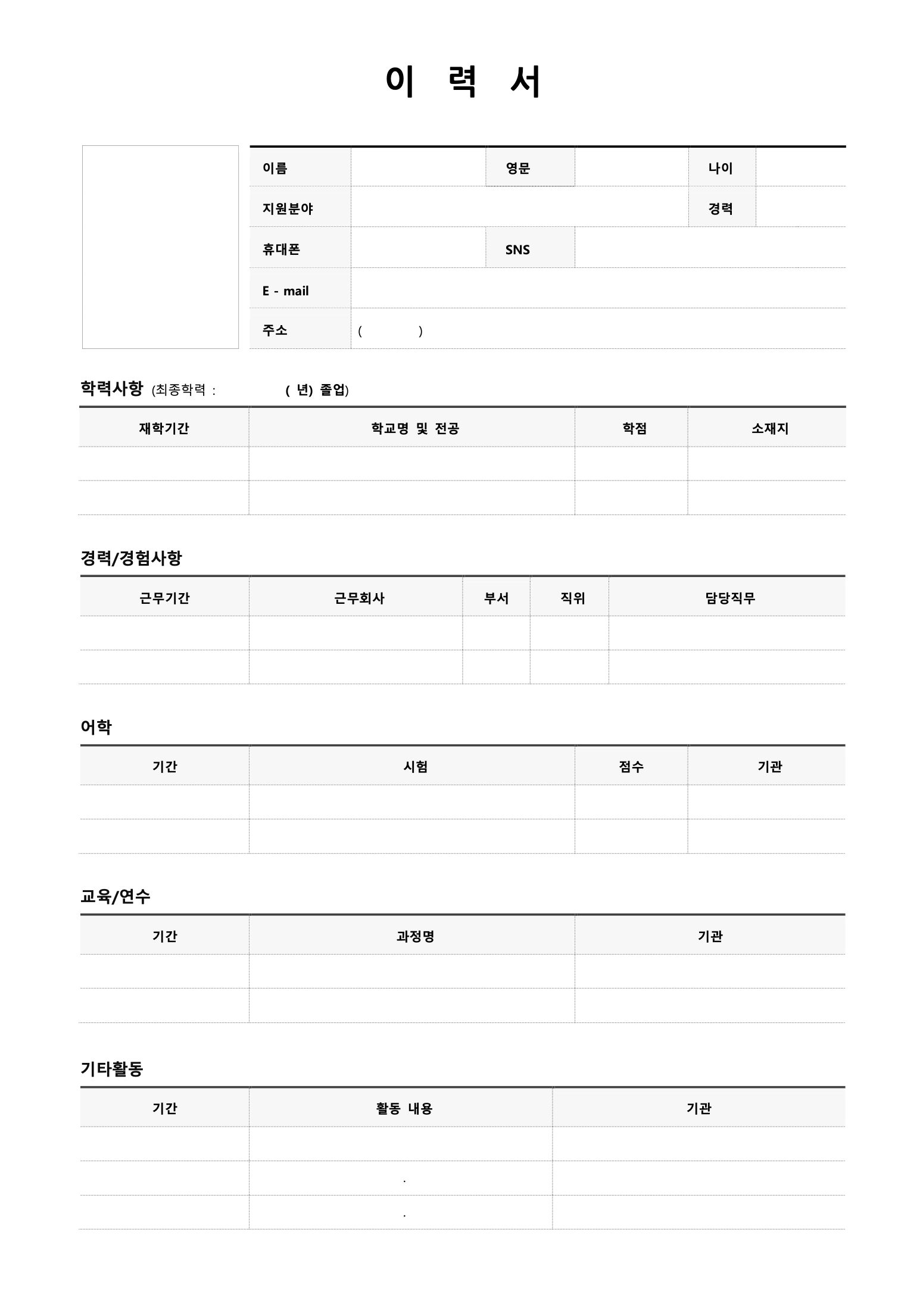 - 학교명, 전공, 입학 및 졸업 연도 - 경력 사항