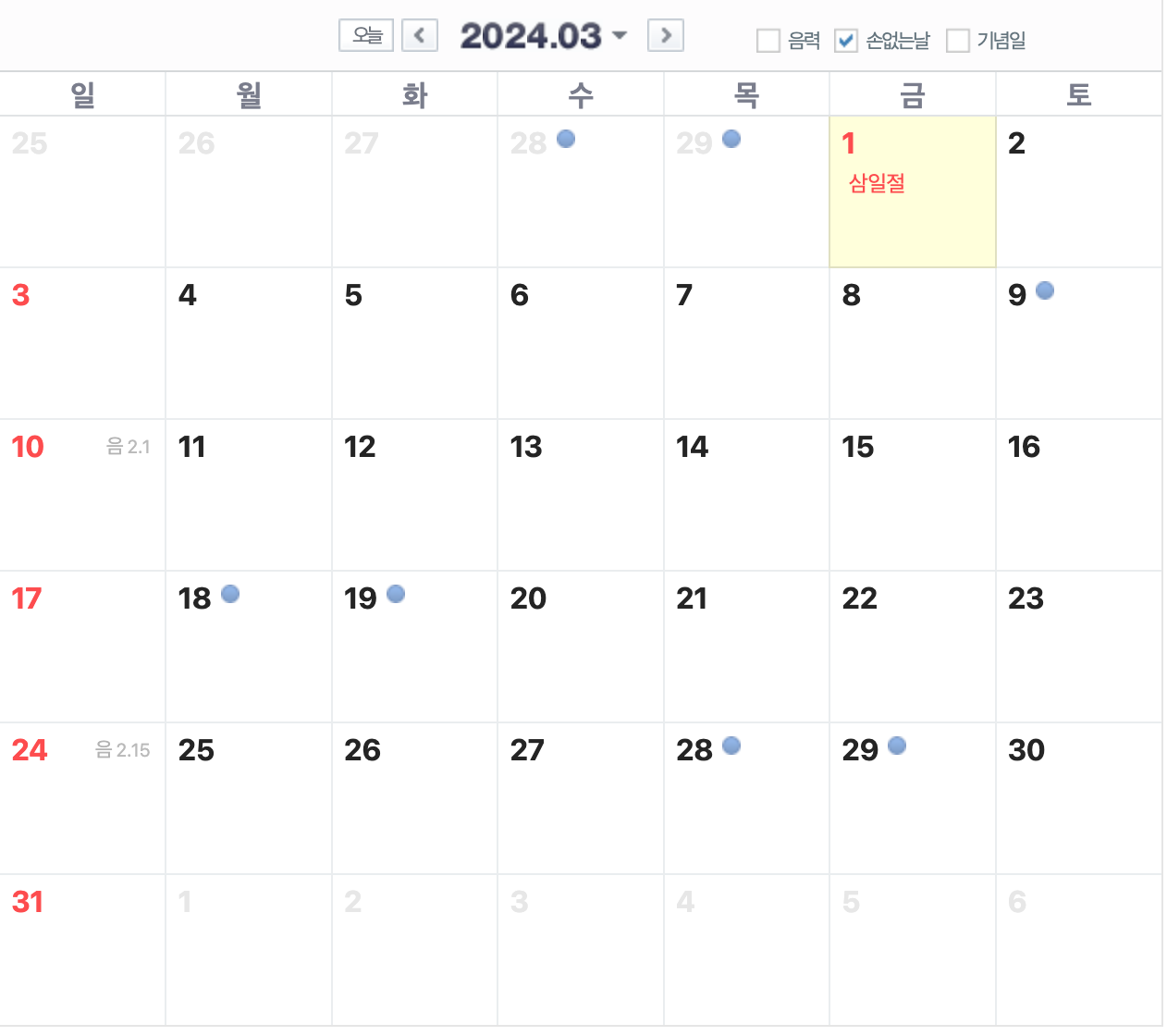 3월은 9일, 18일, 19일, 28일, 29일 입니다.